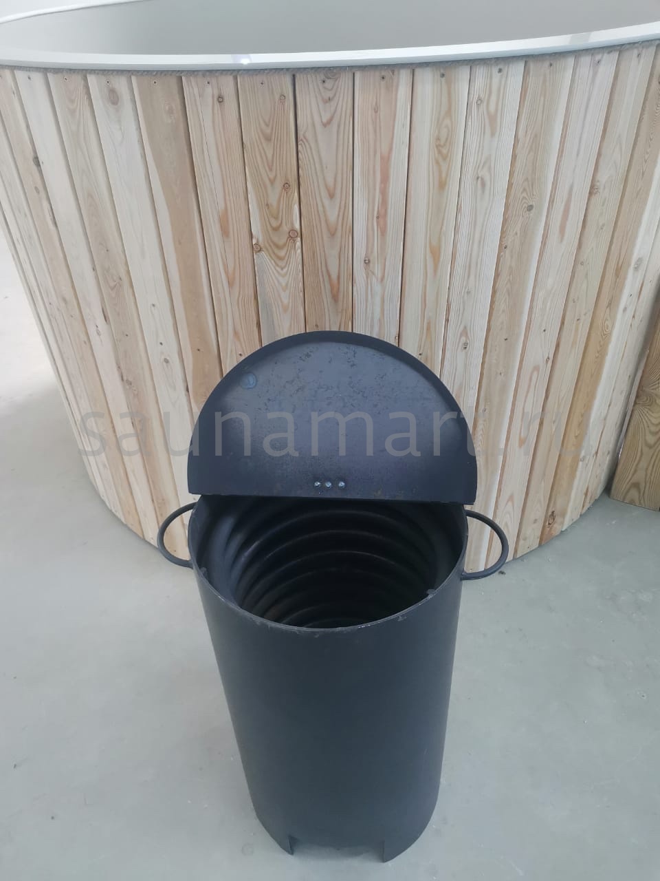 Именно такое парение считается полезным и правильным. Печь установлена под чаном. Так горячая вода поступает снизу вверх.