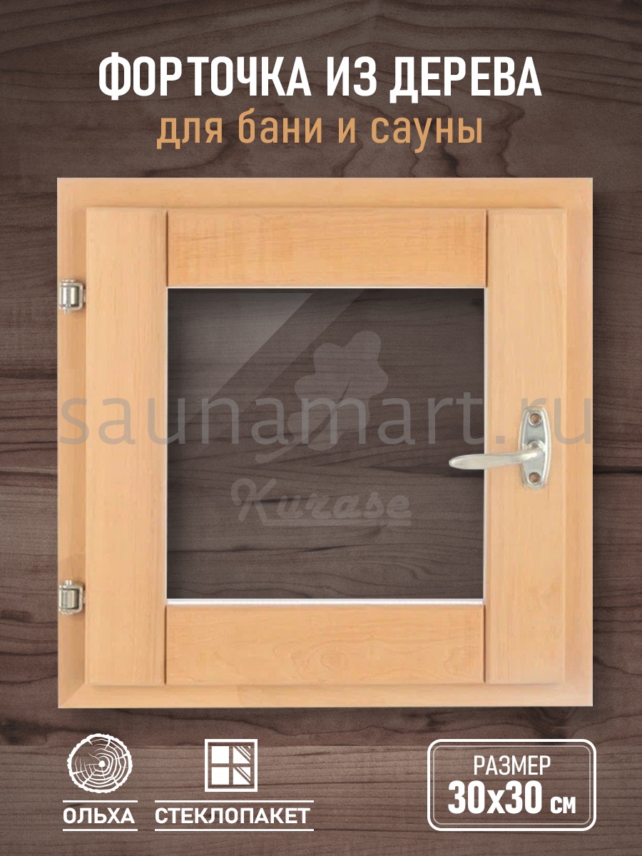 Окно для бани из ольхи. Форточка для бани 30х30 см. Однокамерный стеклопакет. Окошко из прозрачного стекла. Деревянная рама с фурнитурой в комплекте: петли, ручка и затвор. Банное остекление готово к установке нужно только прикрутить ручку. Маленькое окно в парилку снижает теплопотери, обеспечивает проветривание, вентиляцию и поступление дневного света. Деревянное окно необходимый атрибут в русской бане, как дополнение к системе воздухообмена. Одновременное открытие банной двери и окна образует сквозняк, позволяющий обеспечить тщательное проветривание, для сохранности и долговечности внутренней отделки стен, пола, потолка, печи и полок в бане. Оконная рама из лиственных пород, не выделяющих смол, прекрасно переносит условия высокой влажности и температуры, демонстрируя: влагоустойчивость, устойчивость к гниению и образованию грибка. Деревянная форточка может быть использована для строительства и ремонта гаража, дачного туалета и душевой, дачного домика.