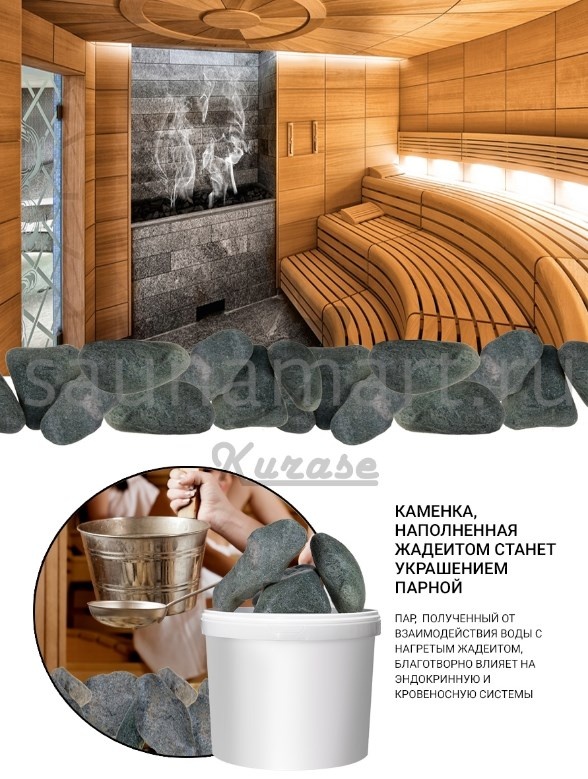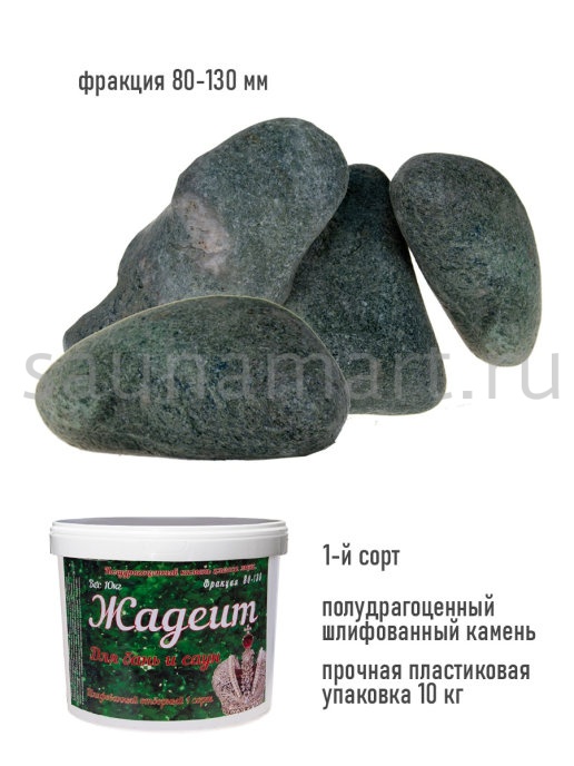 Благодаря своей плотной структуре, жадеитовые камни отличаются длительным сроком службы. Колотые камни прекрасно подходят для заполнения резервуара печи в сауне. Шероховатая поверхность камней гарантирует более активное парообразование.
