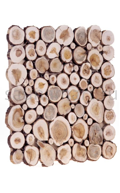 Панно из можжевельника изготавливается из спилов ветвей можжевельника, где изначально можжевеловый ствол имеет небольшой диаметр, поэтому для отделки применяются можжевеловые «спилы», толщиной пару сантиметров. Можжевельник - хоть древесина и прочная с хорошей плотностью, но в процессе обработки не растрескивается и усадку не дает, и впоследствии из нее легко делать абажуры или панно для отделывания стен или потолка.