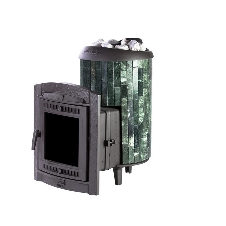 Практичная и компактная модель. Ламели из змеевика, расположенные по периметру внешней каменки, не только обладают отличными теплонакопительными свойствами, но и придают печи уникальный внешний вид.