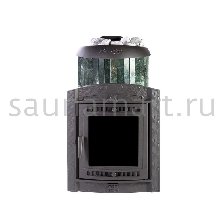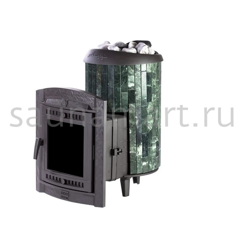 Модель с увеличенной каменкой и повышенной производительностью. Ламели из змеевика, расположенные по периметру внешней каменки, не только обладают отличными теплонакопительными свойствами, но и придают печи уникальный внешний вид.