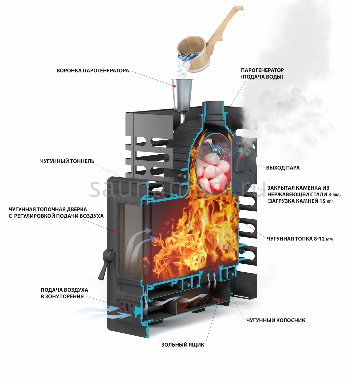 - Закрытая каменка из нержавейки, размещённая в самом горячем месте печи.