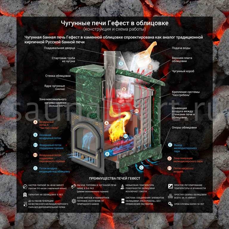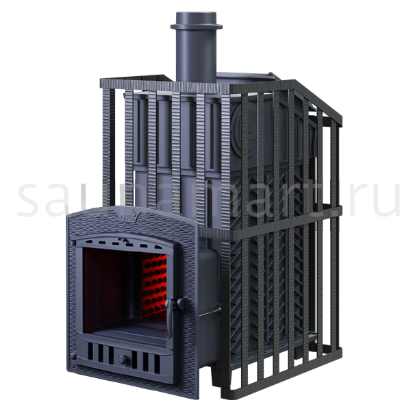Печка Гефест Ураган может быть модернизирована до полноценной печи для русской парной. Для этого кованная сетка заменяется на каменную облицовку без необходимости разборки отопителя.