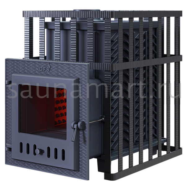 GFS ЗК 30 (М) в сетке — это печь с усиленной каменкой большей массы, с единым углублением внутрь топки для дополнительной укладки чугунного заряда. Теплосъемные шипы, со стороны горения пламени, в разы увеличивают площадь соприкосновения огня с каменкой и ускоряют передачу тепла, а также способствуют лучшему дожигу, смешивая потоки пламени и воздуха, поступающего из воздушника. Эти усовершенствования значительно повышают мощность парообразования печи и выдают большее количество пара при непрерывной подаче воды. Каменка печей GFS-ЗК является незаливаемой.