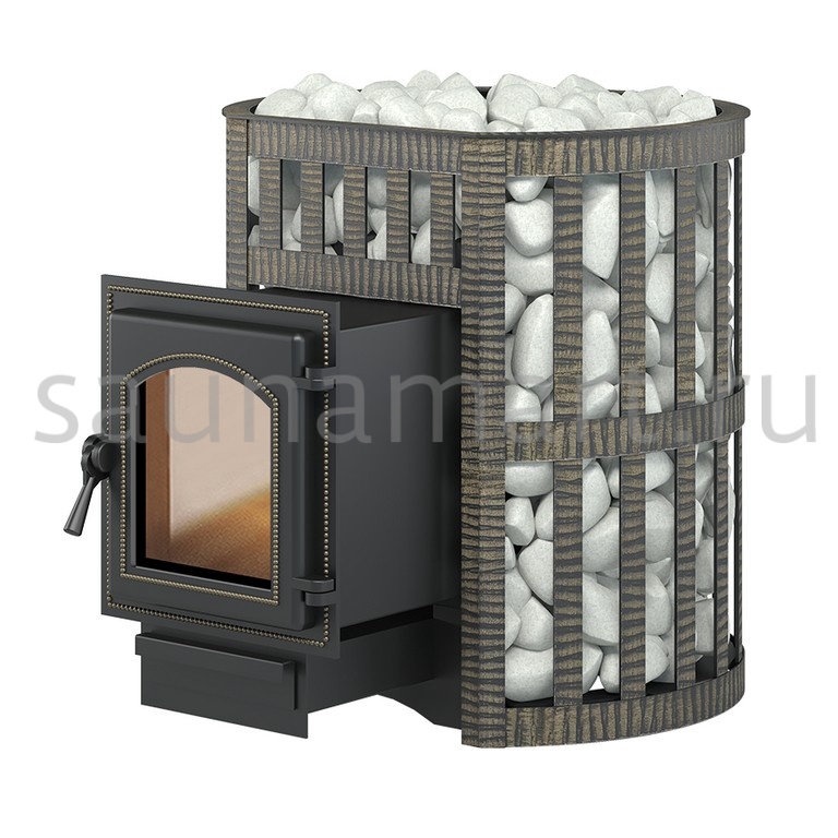 Банная чугунная печь «Легенда Ковка 16 (270)» укомплектована чугунной герметичной дверцей Везувий 270 с жаропрочным стеклом «SCHOTT ROBAX». Конвекционно-вентилируемый кожух «Ковка» изготовлен из металлической текстурированной полосы, покрашенной термостойкой краской и покрытой патиной «Бронза».
