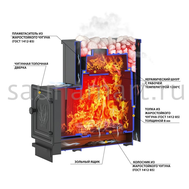 • Материал топки: жаростойкий чугун (ГОСТ 1412-85)