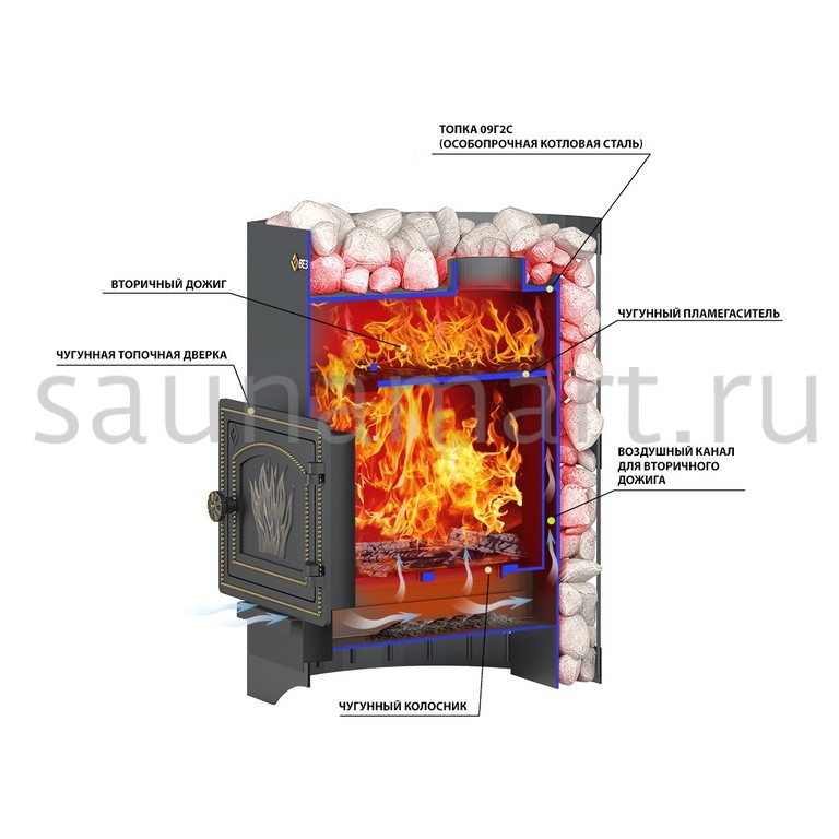 Преимущество печи Скиф заключается в конструкции из стальной стали толщиной 6-8 мм, наличии чугунного зуба-отбойника, чугунной топочной двери и колосниковой решётки, а также в конвекционно-вентилируемом кожухе «СЕТКА», вмещающем до 130 кг камней, и долговечности до 10 лет.