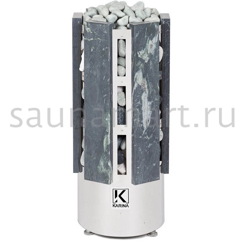 Электрокаменка Karina Forta 10 Талькохлорит предназначена для использования в парных объемом до 14 м?. Печь выполнена в напольном варианте и обладает цилиндрической формой, дополненной плитами из натурального камня Талькохлорита.