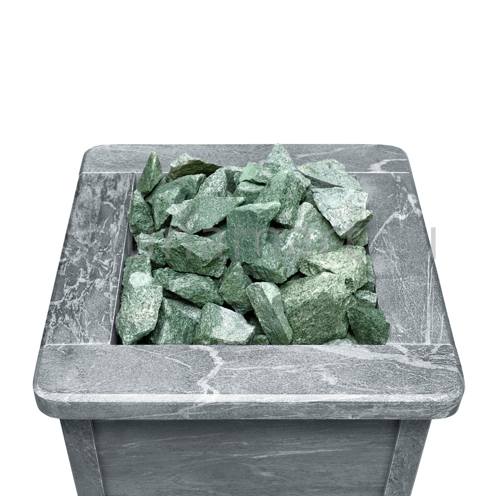Главной особенностью серии Quadro является полная облицовка натуральным талькохлоритом - камнем с уникальными теплоаккумулирующими свойствами. При нагреве талькохлорит мягко излучает тепло, создавая особый микроклимат в парной. Этот природный материал не только обеспечивает равномерный прогрев, но и выделяет полезные минеральные вещества, благотворно влияющие на здоровье.