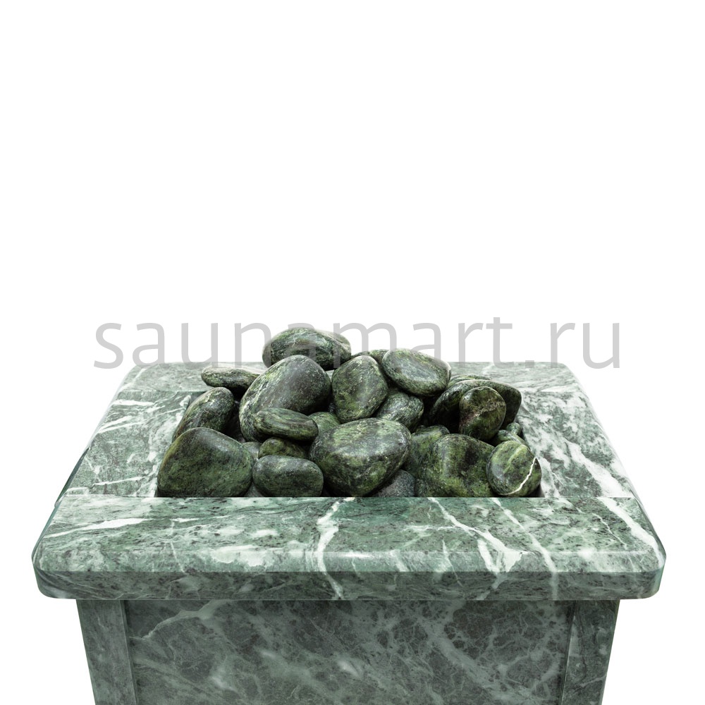 Электрическая каменка со всех сторон облицована натуральным змеевиком. Печь с подобным дизайном стильно смотрится в парильном помещении. Змеевик уже долгие годы используется для внутренней отделки бань. Его называют «аптекарским камнем» за его целебные качества. Минерал оказывает обеззараживающий эффект, положительно влияет на кости, оказывает успокаивающее воздействие и укрепляет иммунитет.