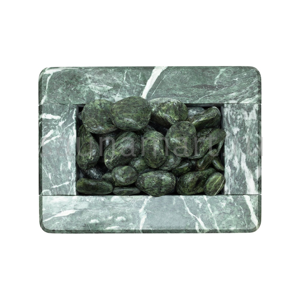 Электрическая каменка со всех сторон облицована натуральным змеевиком. Печь с подобным дизайном стильно смотрится в парильном помещении. Змеевик уже долгие годы используется для внутренней отделки бань. Его называют «аптекарским камнем» за его целебные качества. Минерал оказывает обеззараживающий эффект, положительно влияет на кости, оказывает успокаивающее воздействие и укрепляет иммунитет.