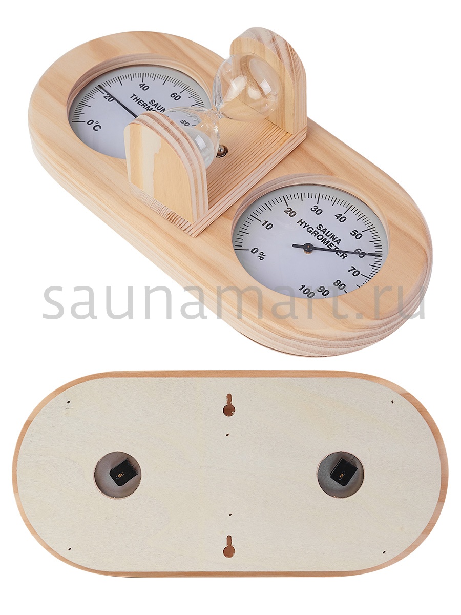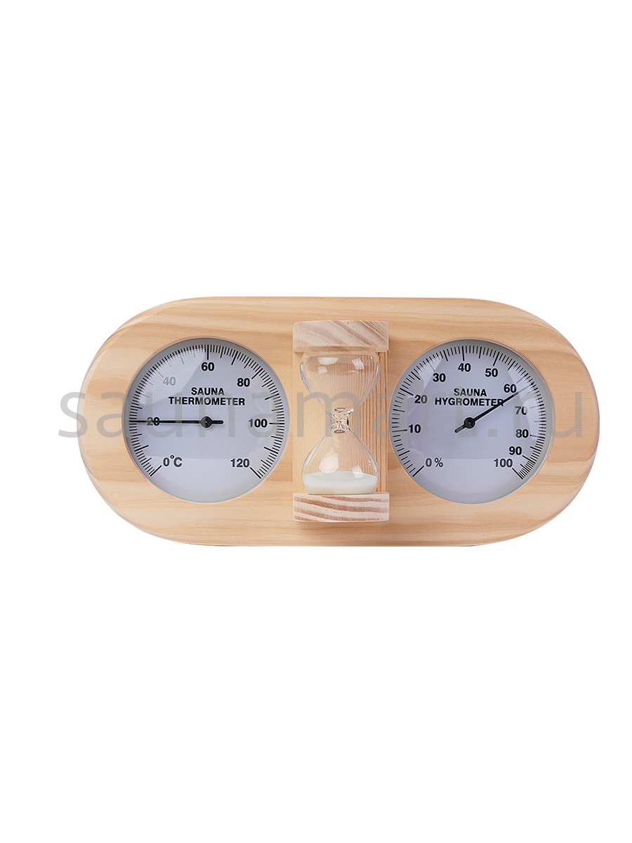 Термогигрометр со встроенными песочными часами 3 в 1 это товары для бани и сауны, - универсальные аксессуары для обустройства бани, которые создают уют, комфорт, удобство и особенную атмосферу в парилке русской бани. В широкой раме из дерева находятся два круглых циферблата под термостойким стеклом: термометр и гигрометр. Градуировка шкалы гигрометра варьируется в пределах от 0 до 100 %. Градуировка шкалы термометра варьируется в пределах от 0 до 120 градусов по Цельсию. Предусмотрена возможность калибровки измерительного прибора. Между циферблатами располагаются песочные часы для бани, рассчитанные на 15 минут. Это идеальное время нахождения в парилке. Банный аксессуар не боится высокой влажности и температуры, поэтому идеально подходит для использования в любом парильном помещении, как в условиях русской бани, финской сауны так и хамама. Предназначен для настенного размещения. Помните, чтобы проведённое в парной время оказало благоприятный эффект на здоровье и самочувствие, необходимо тщательно соблюдать температурный режим парения, режим влажности и длительности пребывания в парной. Не подвергайте прибор ударам и падению. Упаковано в картонную коробку. Все банные принадлежности нужно выбирать тщательным образом. Представленный банный аксессуар изготовлен из экологичного сырья и прошел все этапы сушки и обработки. Банная метеостанция станет прекрасным подарком для банщиков, отца, мамы, дедушки, мужа, сына, внука, друга, брата, которые любят русскую баню. Эта стильное интерьерное решение подойдет еще и для ванной комнаты и балкона.