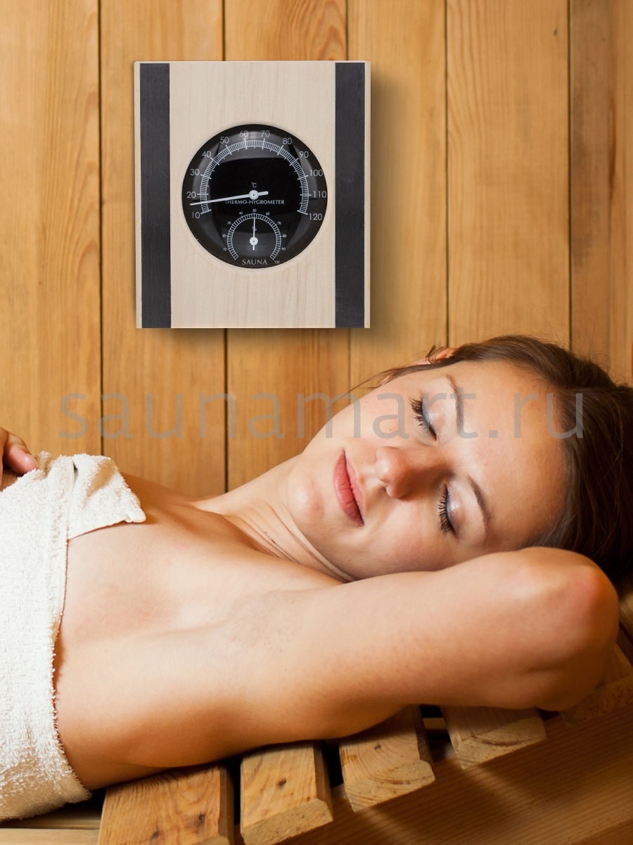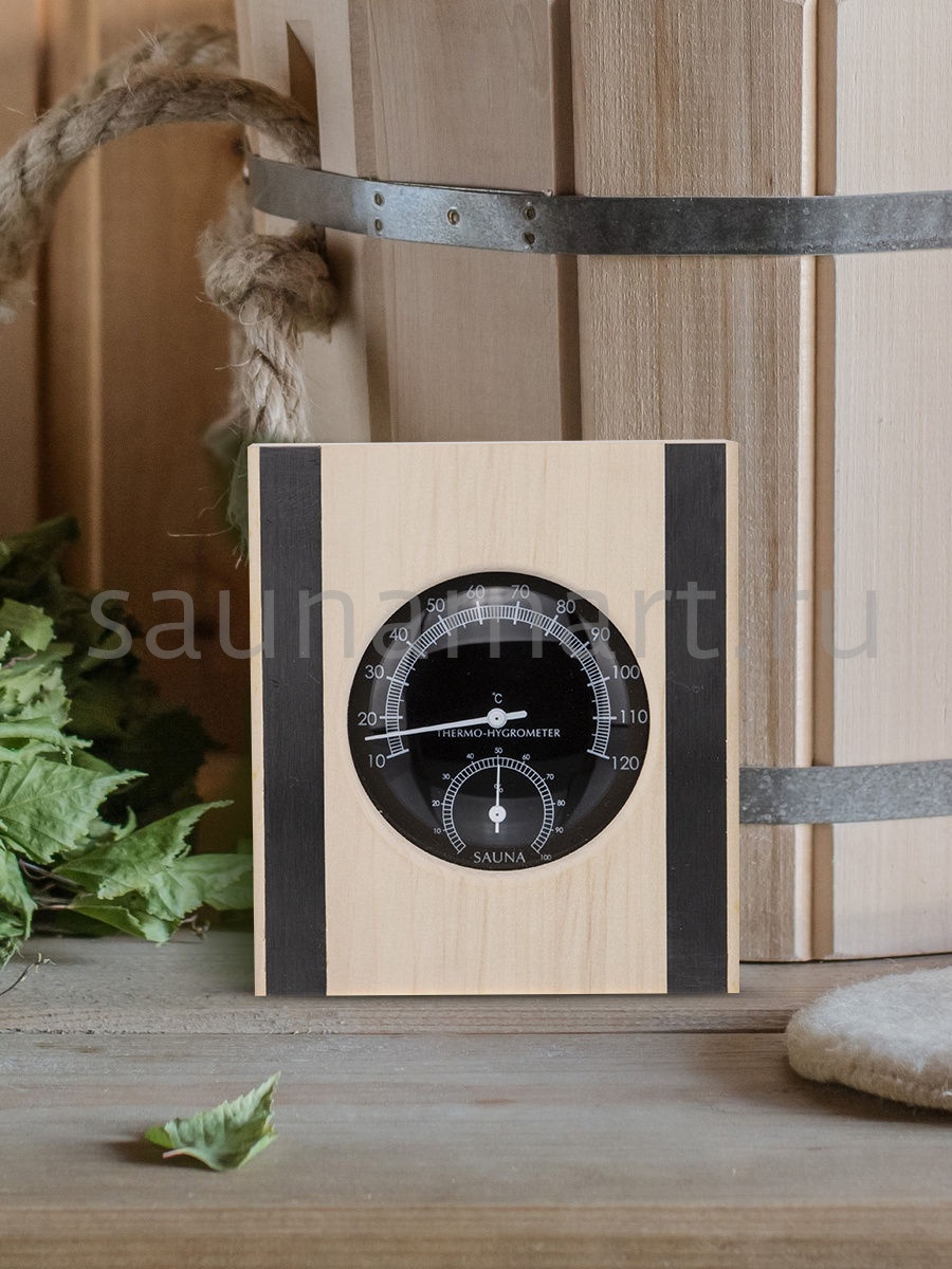 Термогигрометр это комбинированный прибр для измерения температуры и влажности в парной. В лаконичной, стильной, широкой рамке из древесины осины находится большой, круглый, графичный циферблат, по бокам рамка украшена стальными вставками. На циферблате две шкалы. Одна из них - это гигрометр, который с точностью измерит уровень влажности, другая - термометр, который сообщит о температуре воздуха. Данный прибор прекрасно подойдёт для использования в парной. Благодаря универсальному дизайну он станет прекрасным дополнением любого интерьера. Наш термогигрометр соответствует всем требованиям для данных приборов -оснащен не сильно нагревающимся корпусом и способен выдерживать перепады температуры и влажности.