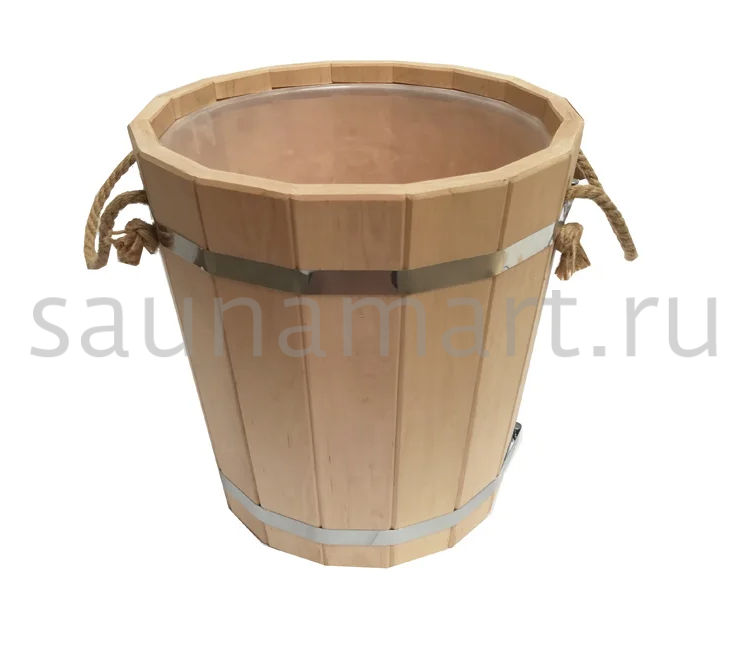 Ушат для бани из лиственницы используют для хранение воды в парной. Изготовлен из деревянных шпунтованных клёпок, надёжно соединённых между собой специальным водостойким клеем и стянутых обручами из ротанговой лианы обеспечивающим особую прочность конструкции и экзотический стильный вид.